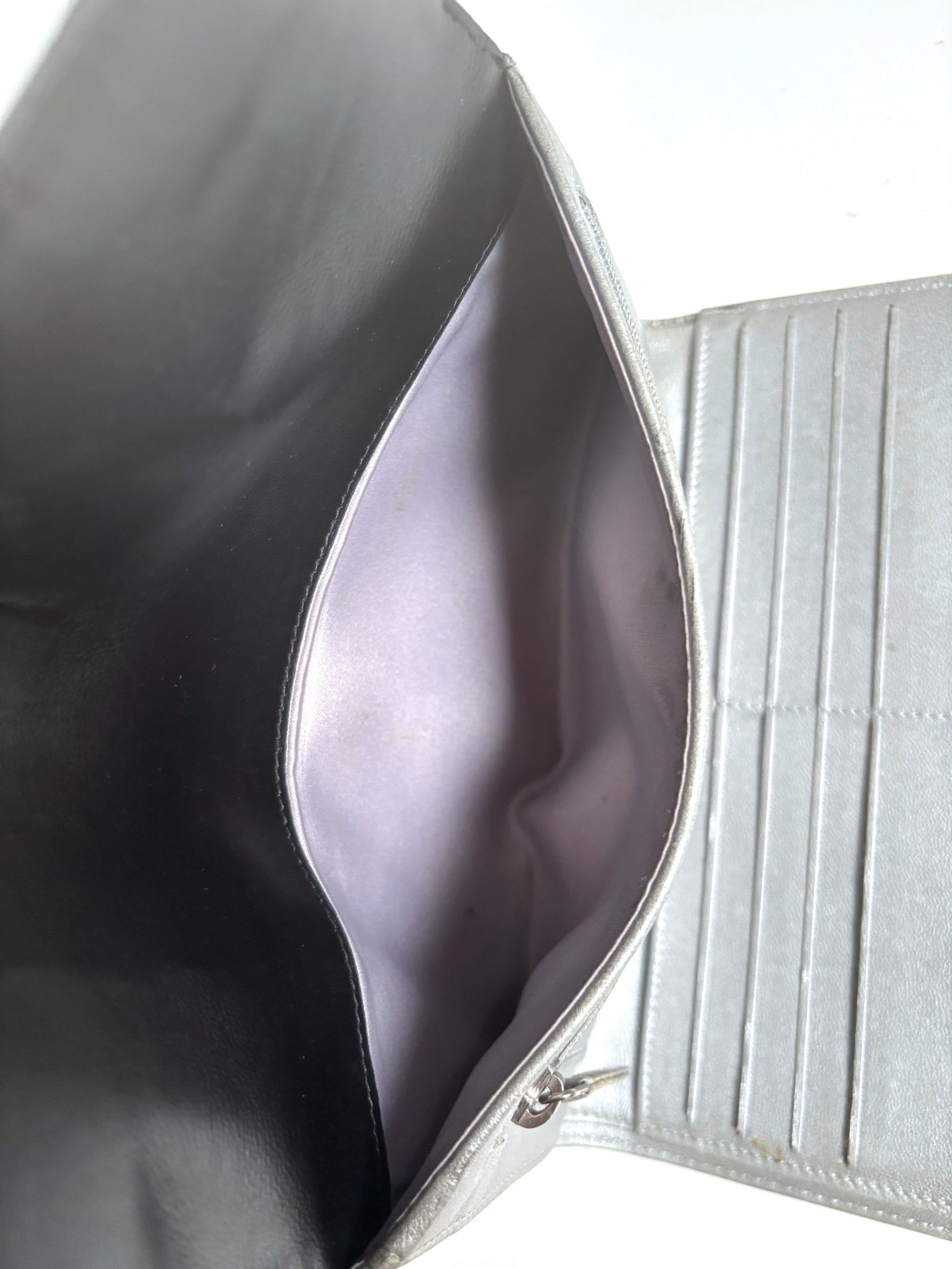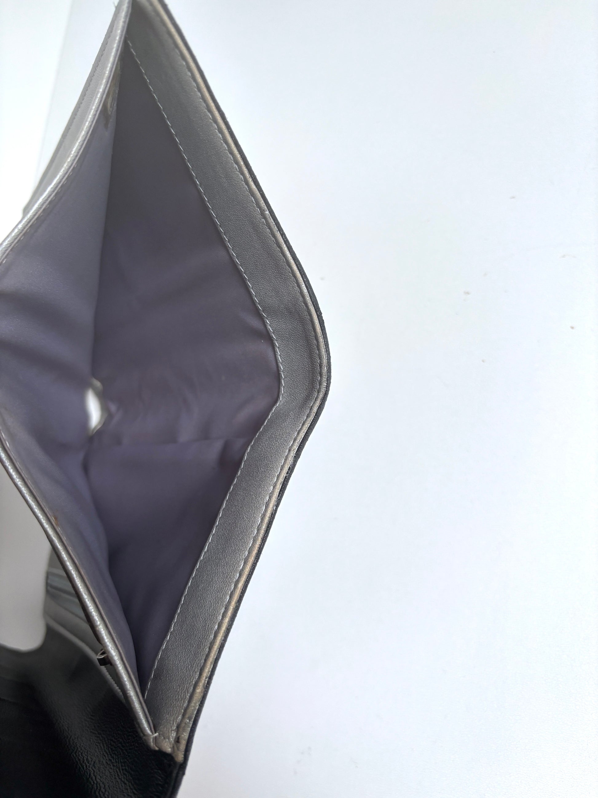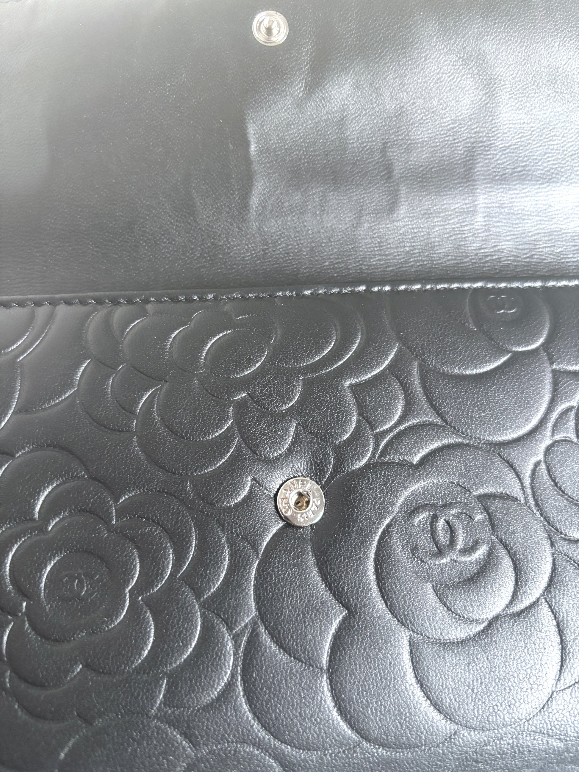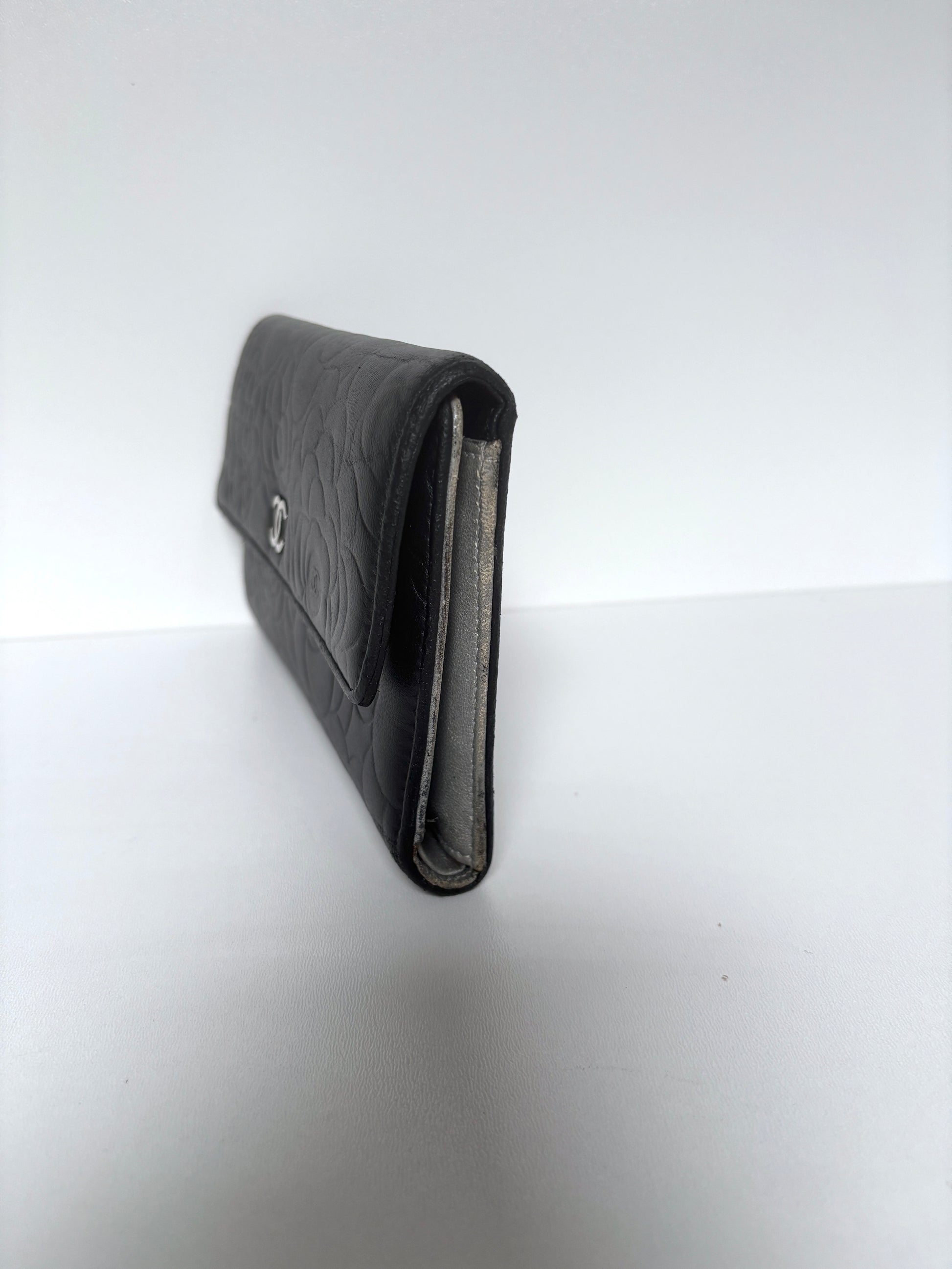 Chanel black leather "Camilia" wallet. Classic silver "CC" logo in front.