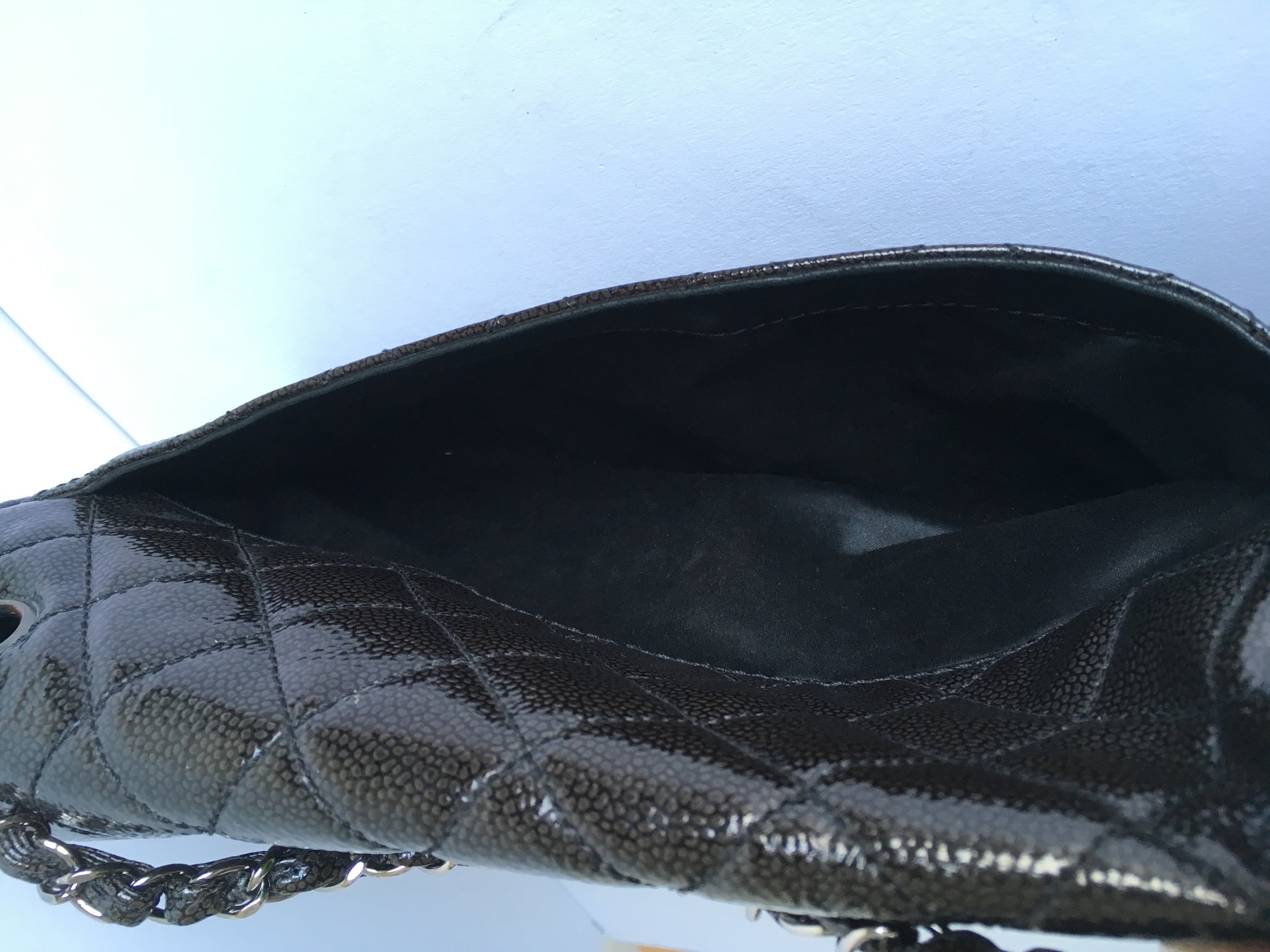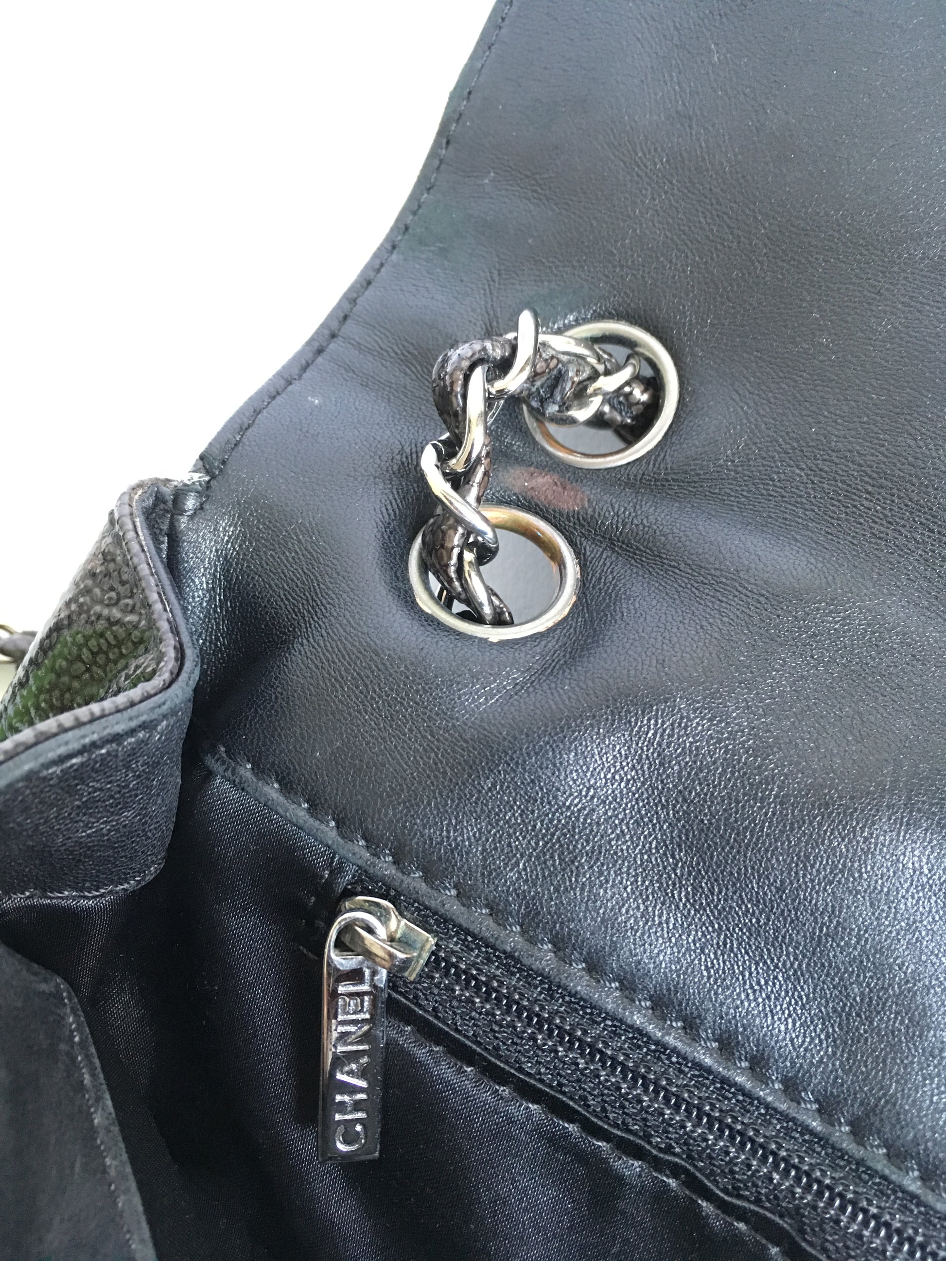 Chanel black caviar leather flap shoulder bag.