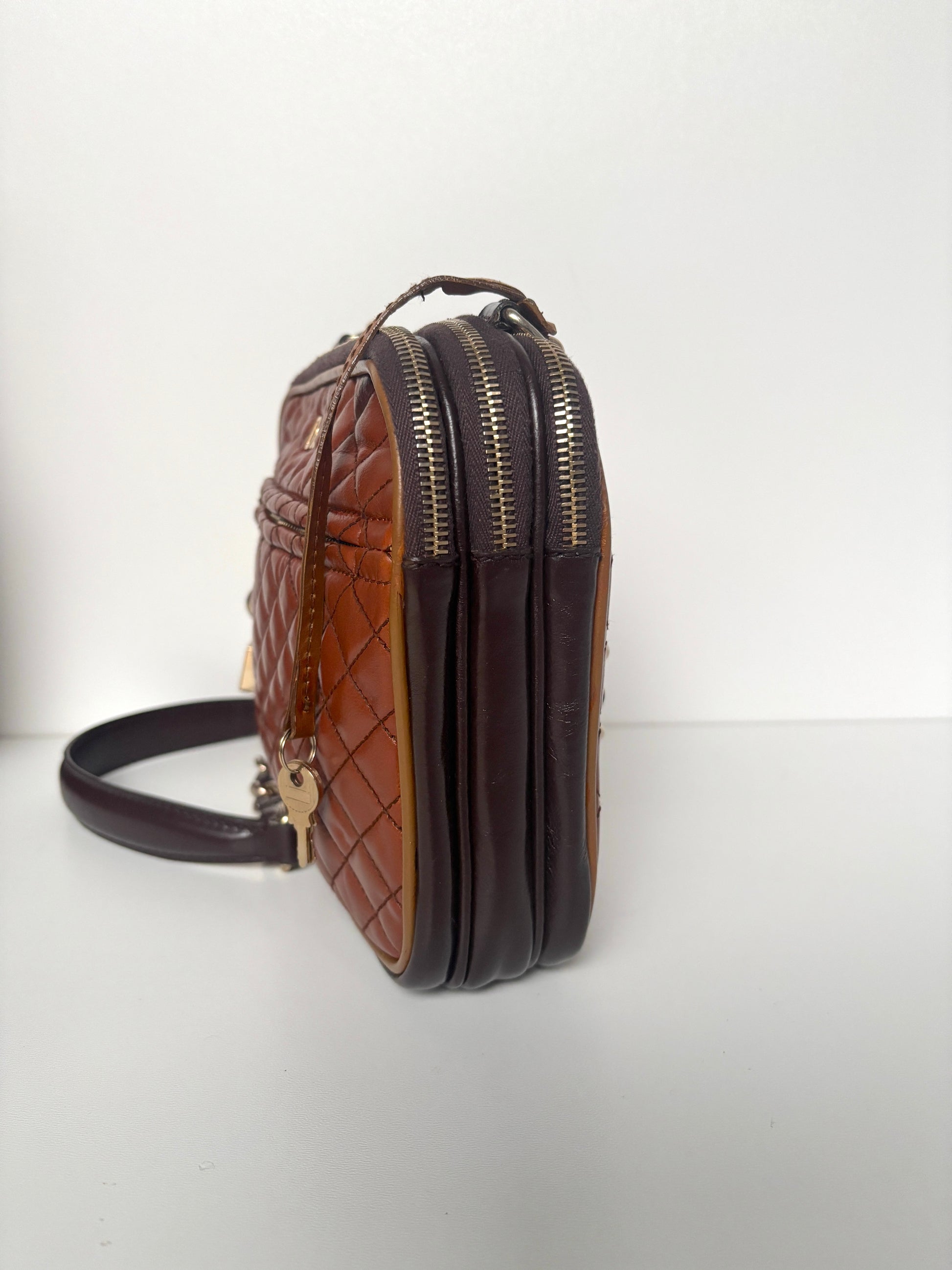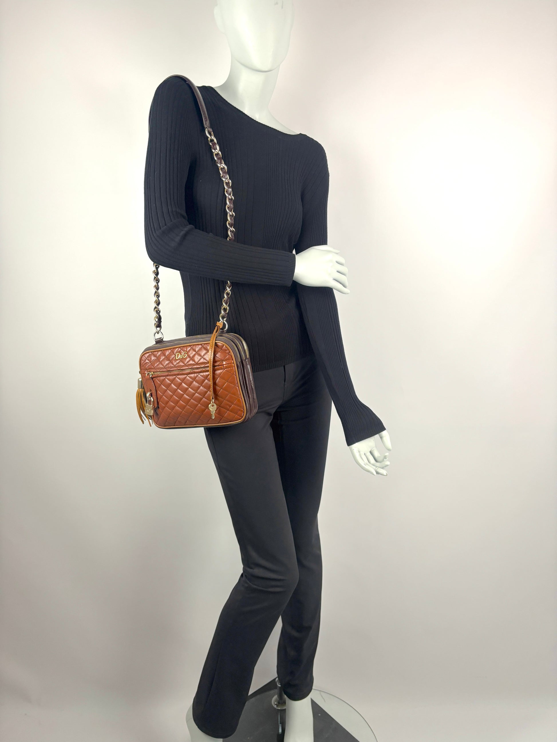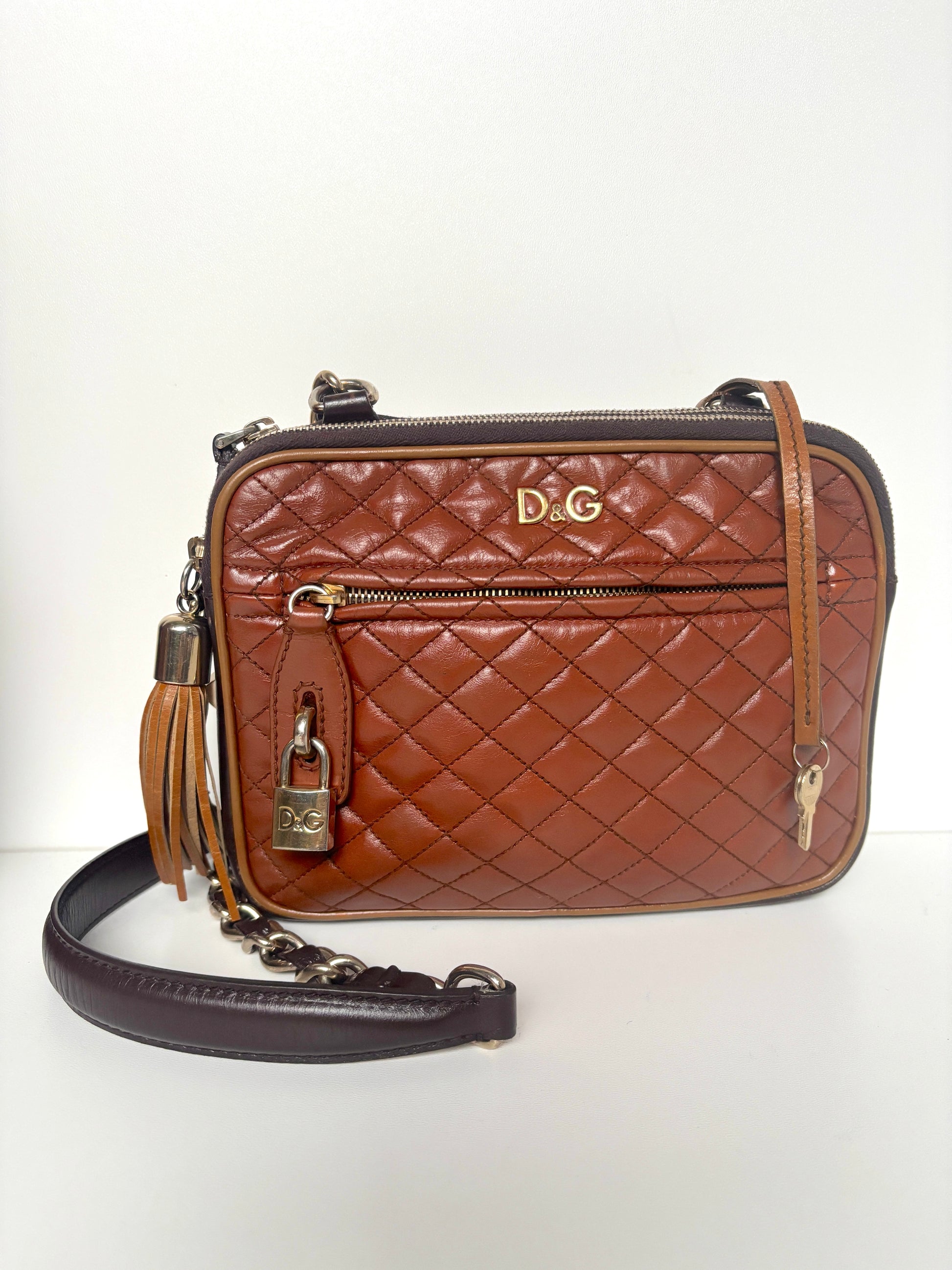 D&G "Lily Glam" shoulder bag in beautiful brown with vintage look. Hardware details in gold-tone. Padlock and charm.