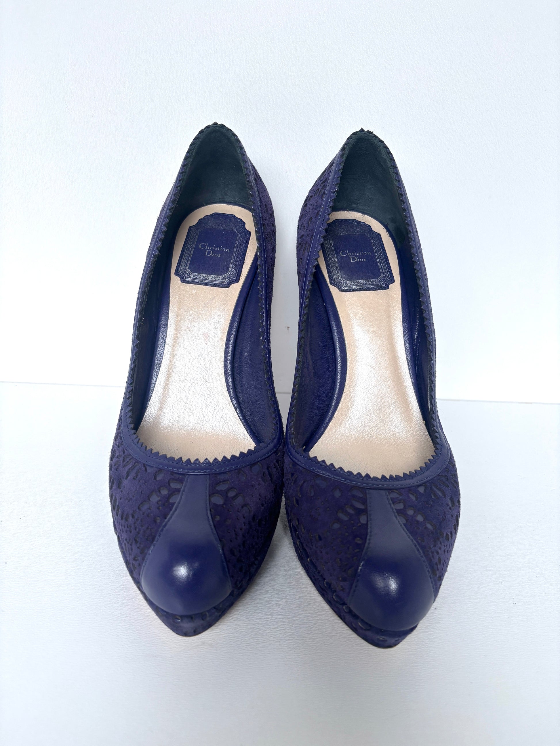Dior "Byz" platform pumps in purple laser-cut suede and leather.