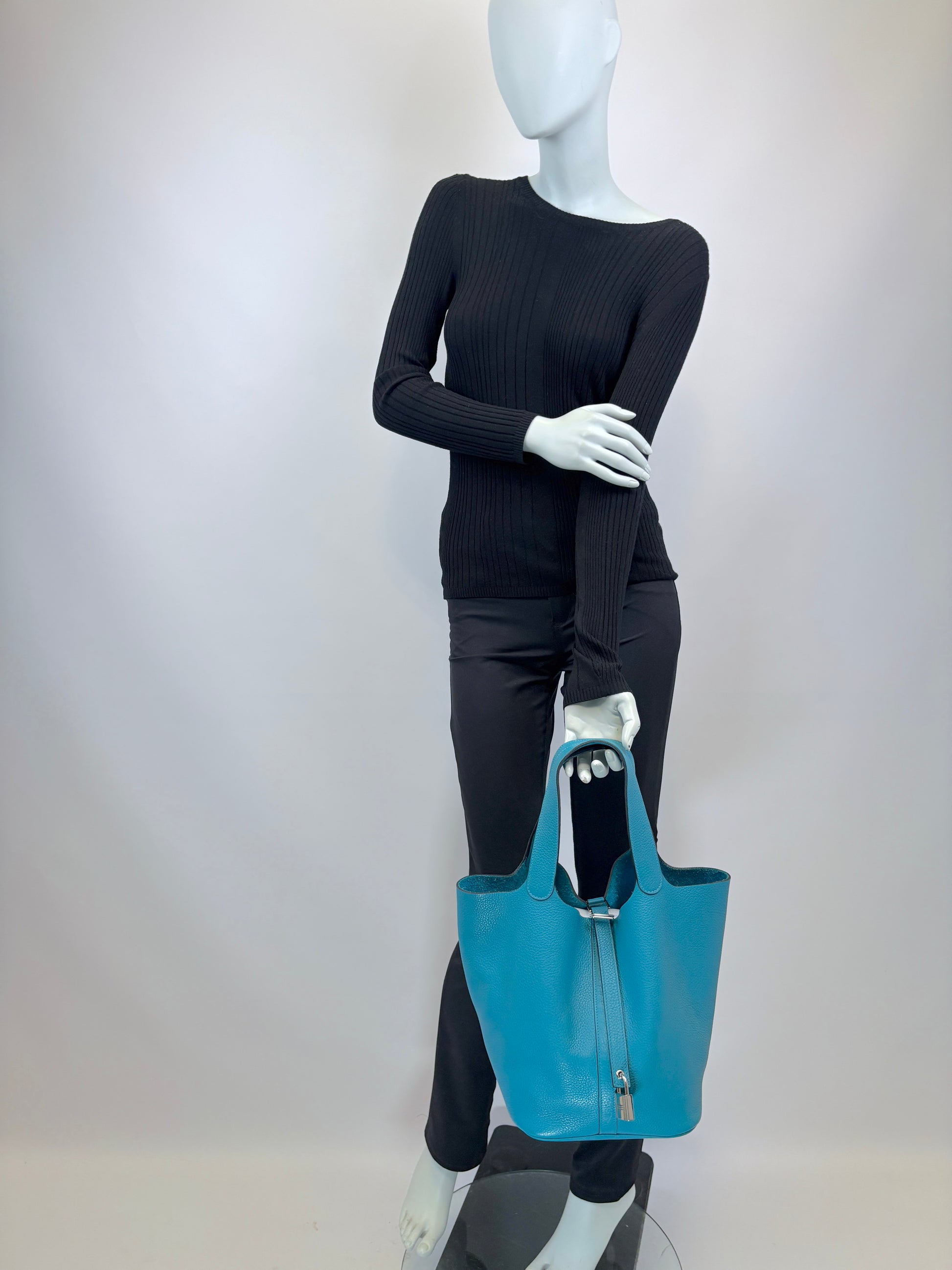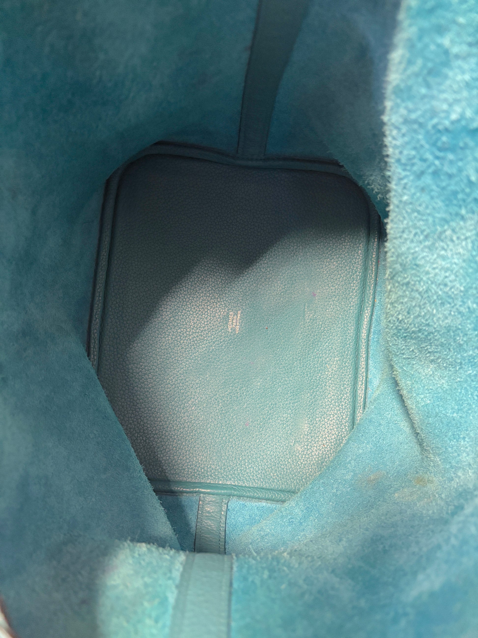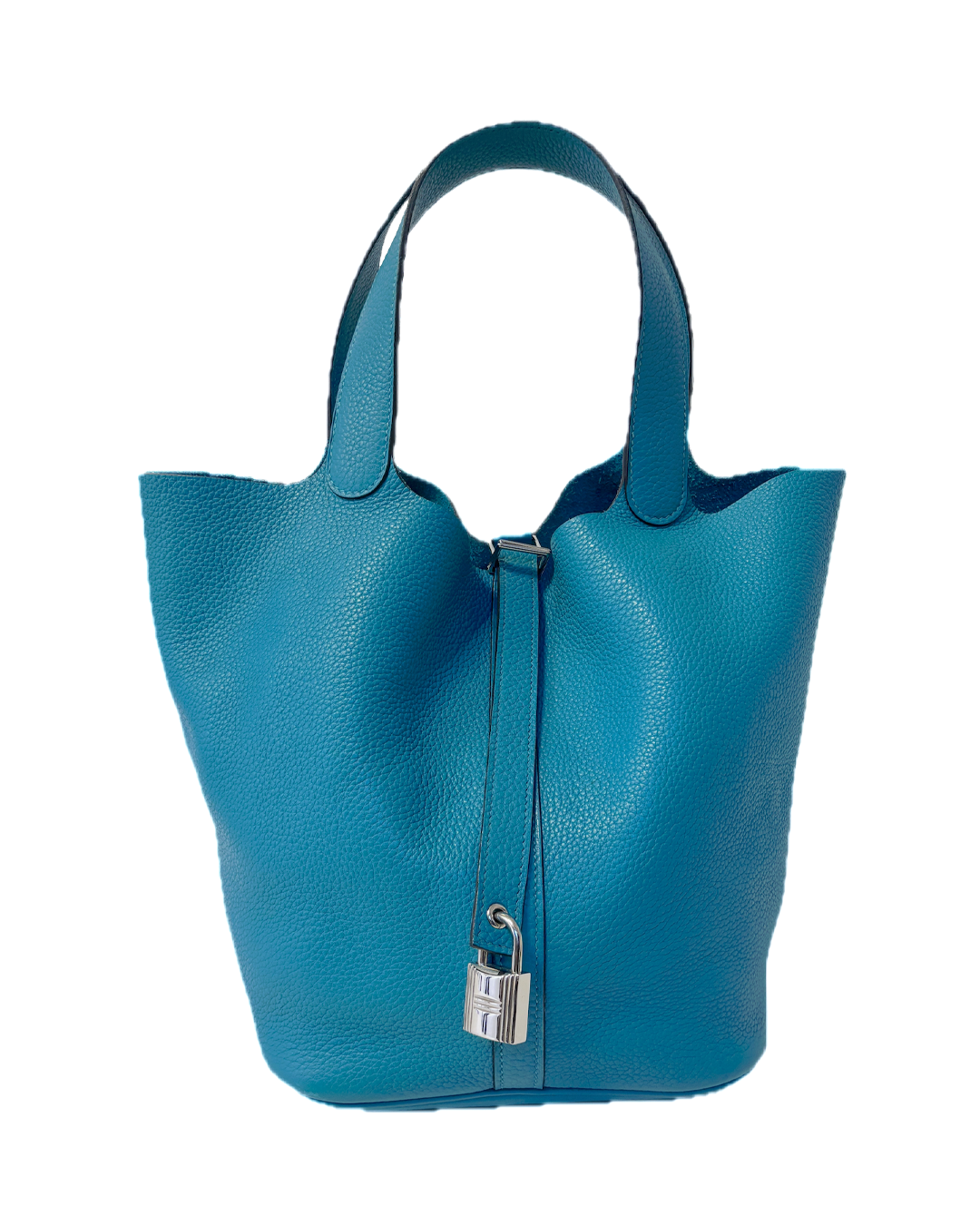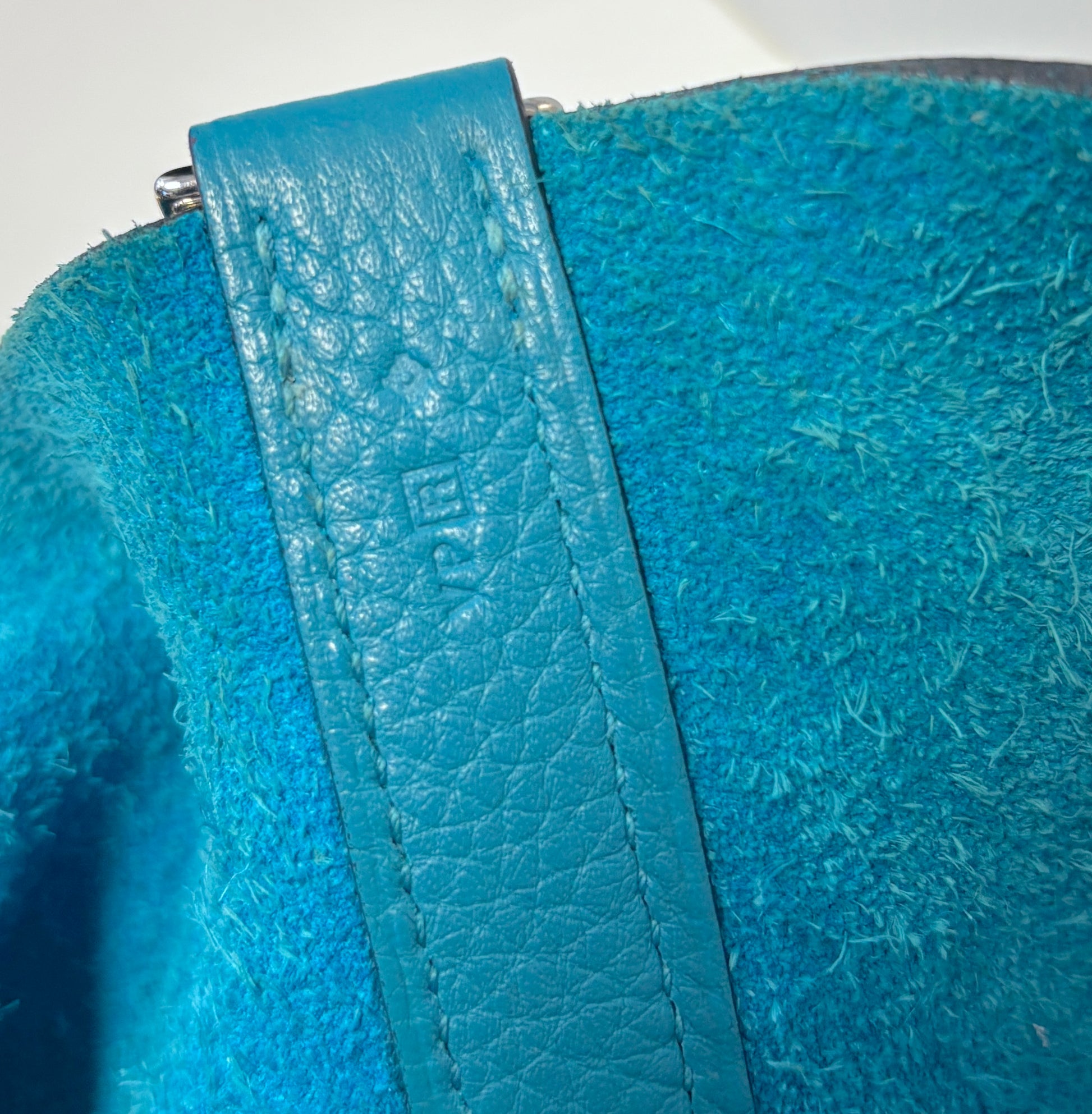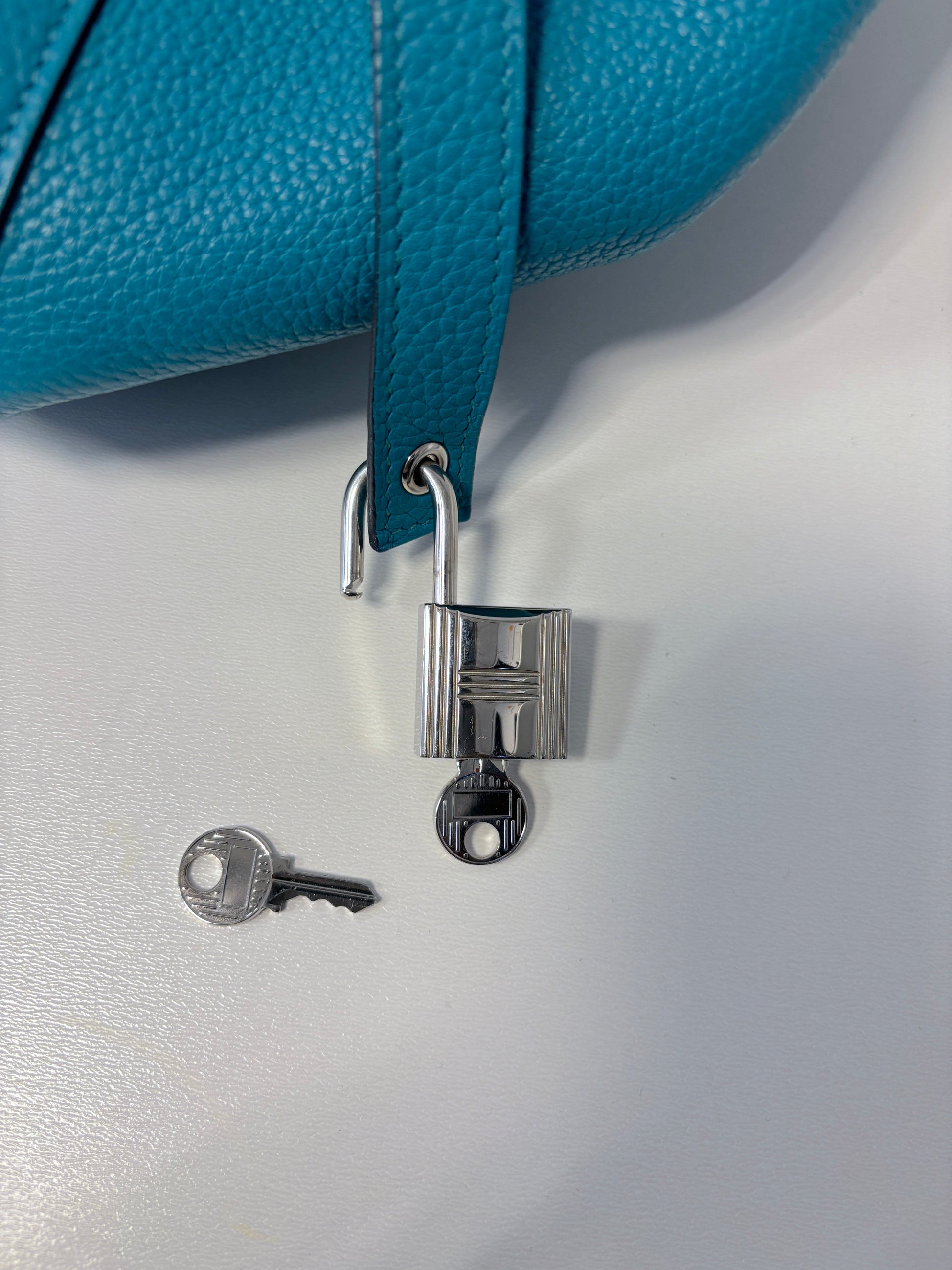 Hermès "Picotin 22" shoulder bag in turquoise color. Silvery padlock and hardware details.