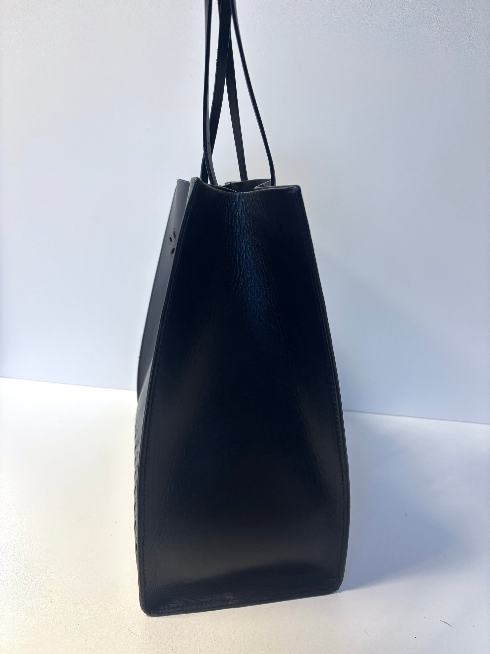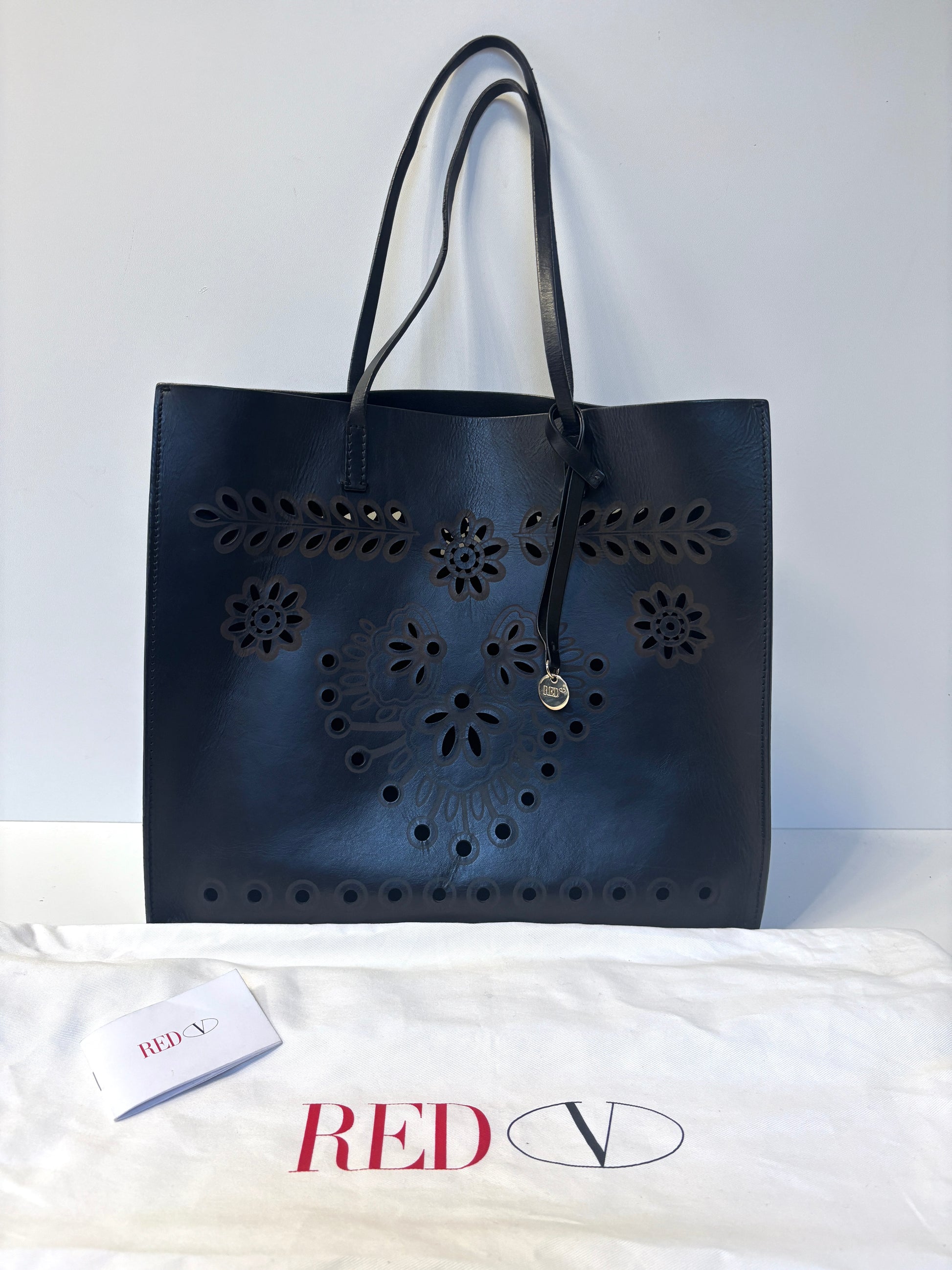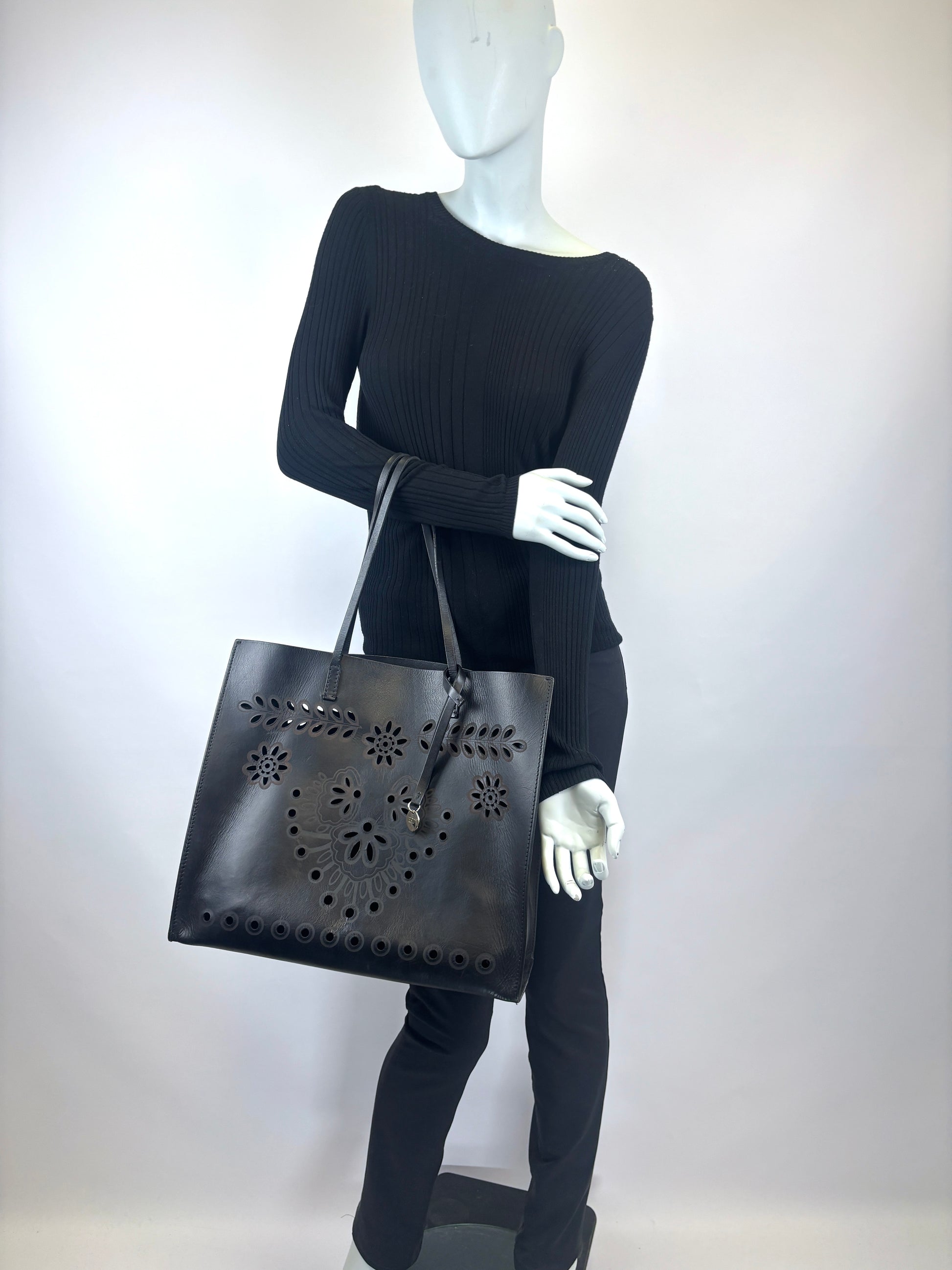 Beautiful floral perforations and leather charm with metal rounded logo.