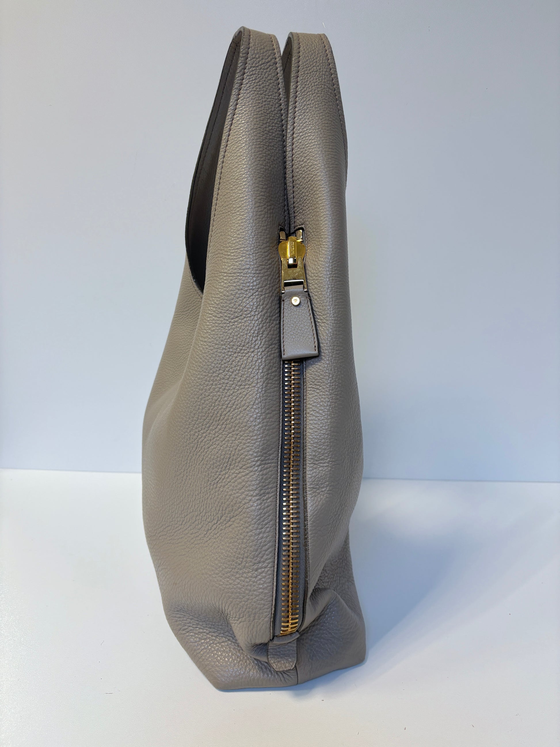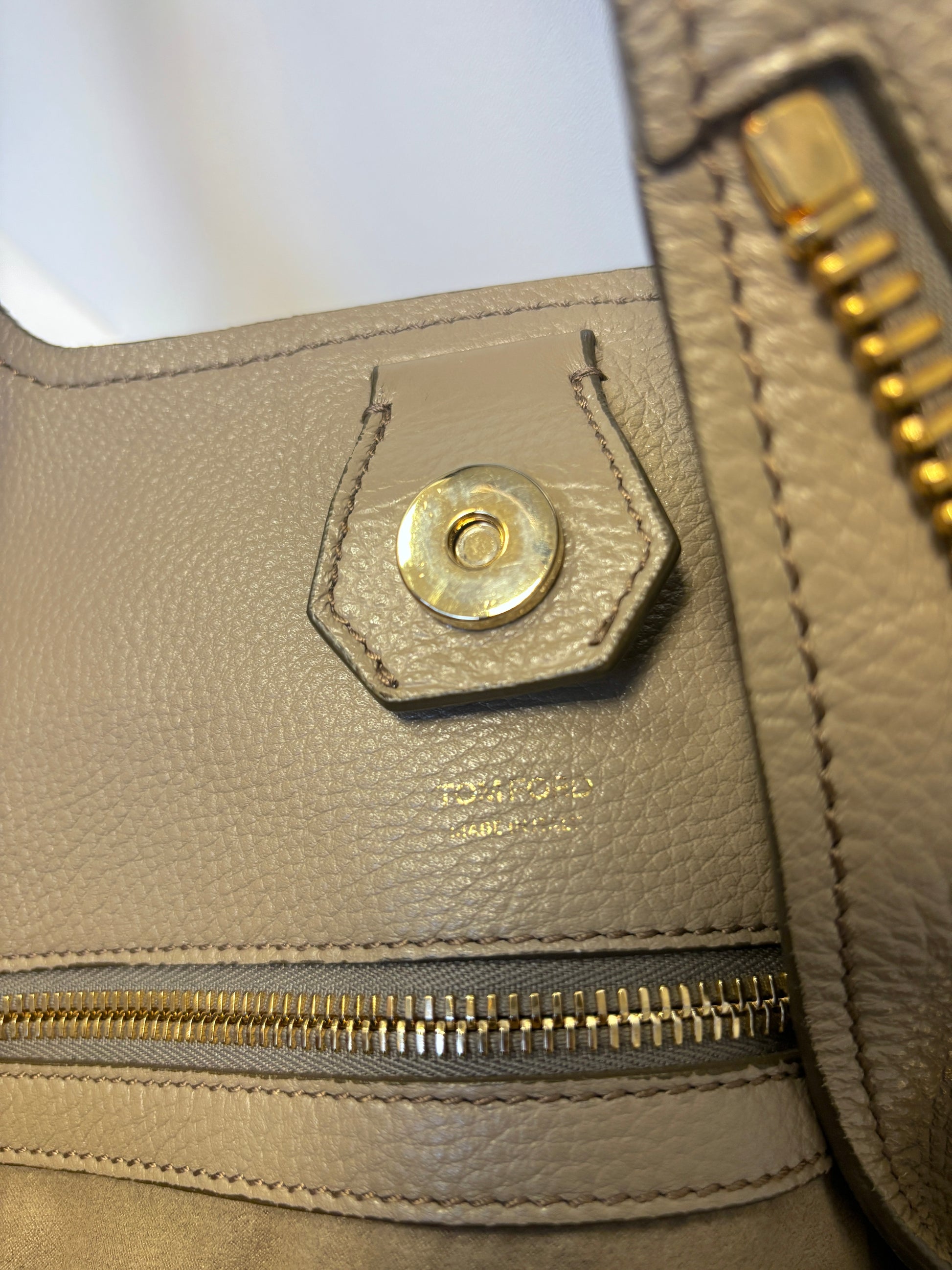 Tom Ford tote bag in beautiful taupe color with golden hardware details.